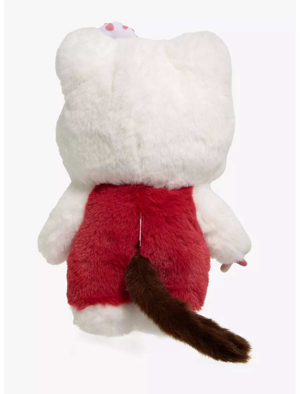 This little Monchhichi is channeling major Hello Kitty cuteness! It's dressed in a full white and red plush Hello Kitty fit complete with her ears, bow, and embroidered facial features. It has a ruffled red gingham bib embroidered with the collab name, and a yellow bow. One hand holds a pacifier.